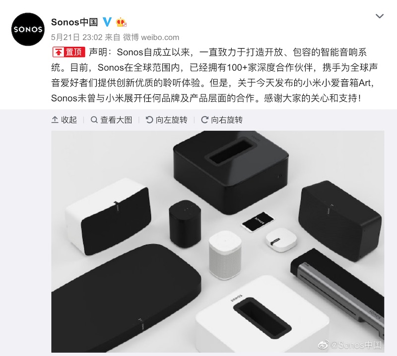称,关于最新发布的小米小爱音箱 Art,Sonos 未曾与小米打开任何品牌及产品层面的协作。